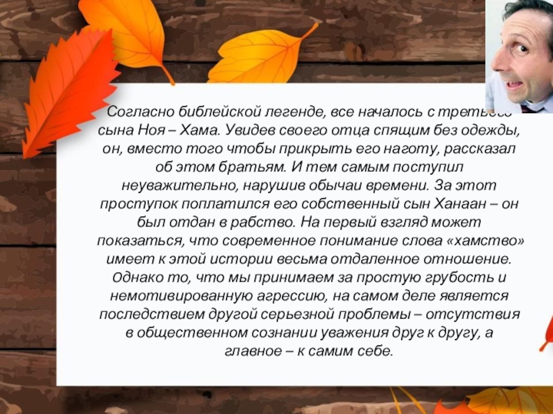 Увидев своего отца спящим без одежды, он, вместо того чтобы прикрыть его наготу, рассказал об этом братьям. И тем самым поступил неуважительно, нарушив обычаи времени. За этот проступок поплатился его собственный сын Ханаан – он был отдан в рабство. На первый взгляд может показаться, что современное понимание слова «хамство» имеет к этой истории весьма отдаленное отношение. Oднако то, что мы принимаем за простую грубость и немотивированную агрессию, на самом деле является последствием другой серьезной проблемы – отсутствия в общественном сознании уважения друг к другу, а главное – к самим себе.