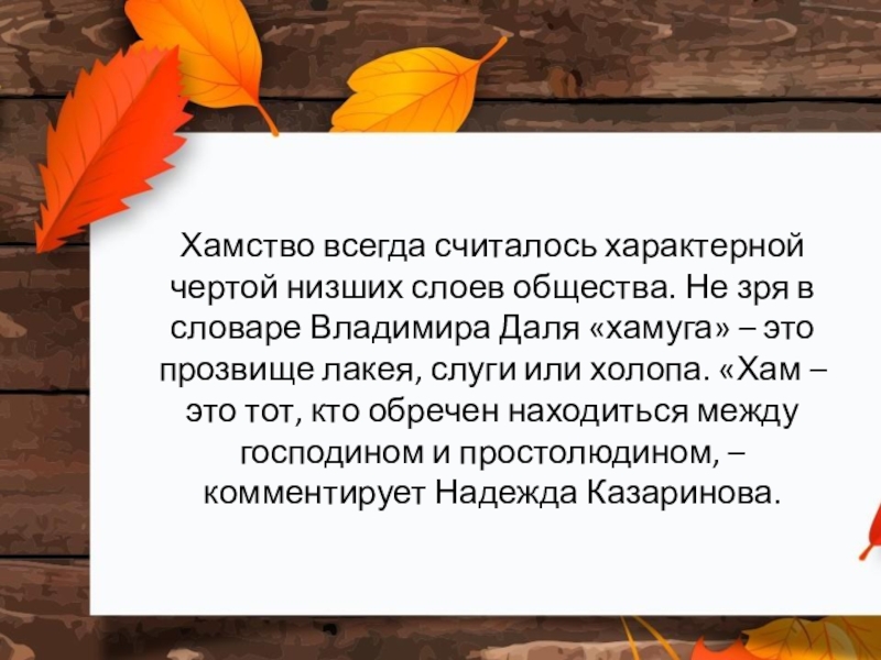Слайд 11Хамство всегда считалось характерной чертой низших слоев общества. Не зря в