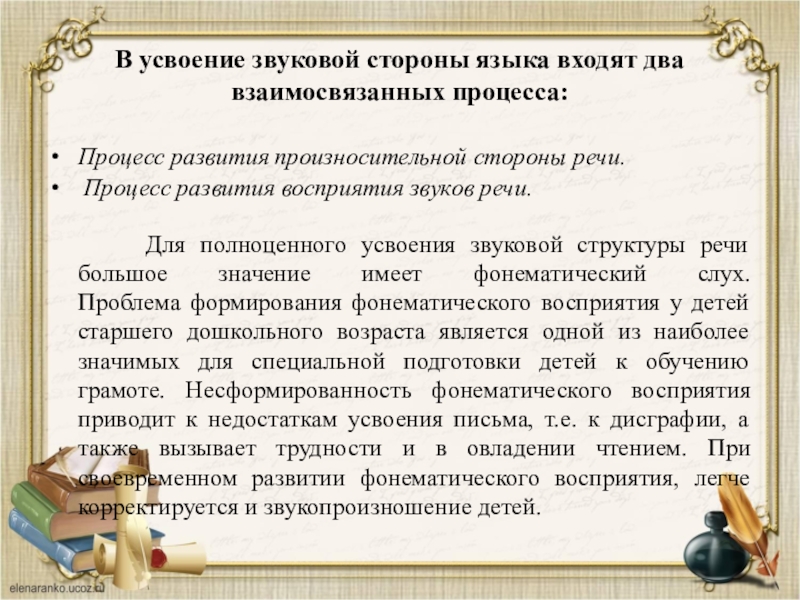 Слайд 4В усвоение звуковой стороны языка входят два взаимосвязанных процесса: