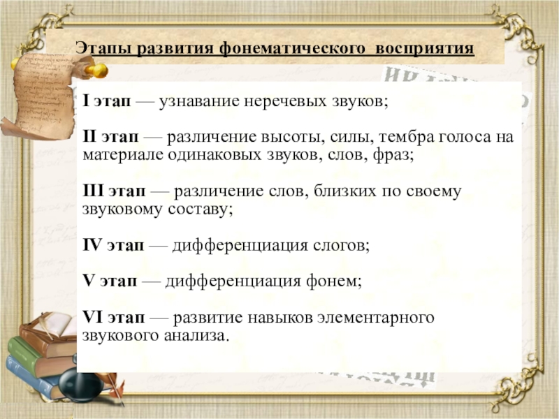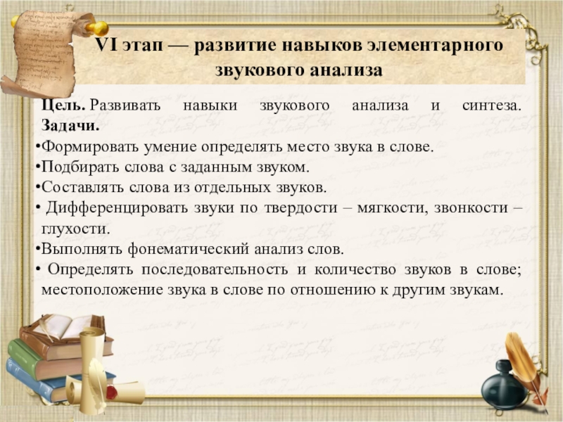 Слайд 17VI этап — развитие навыков элементарного звукового анализа