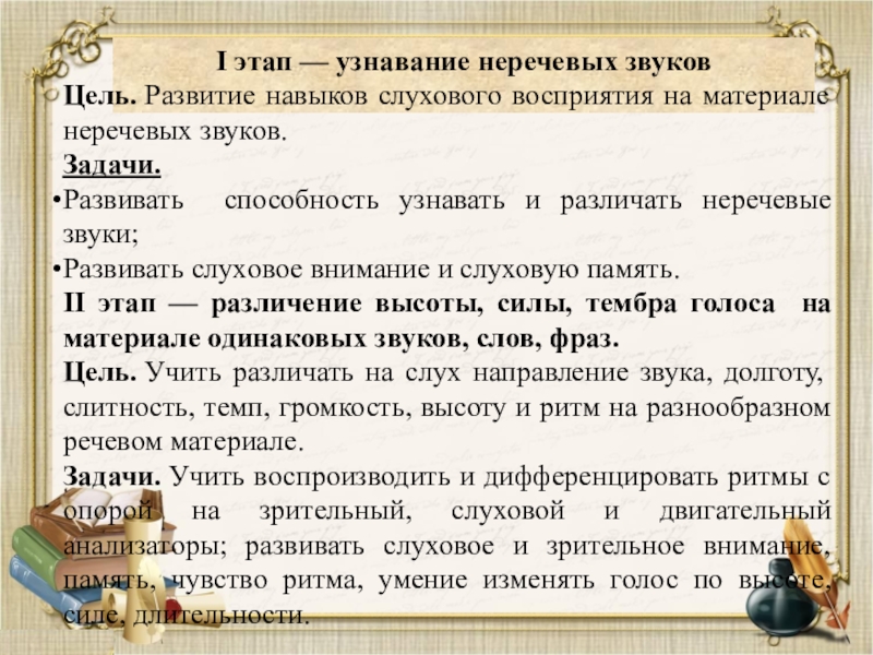 Цель. Учить различать на слух направление звука, долготу, слитность, темп, громкость, высоту и ритм на разнообразном речевом материале.