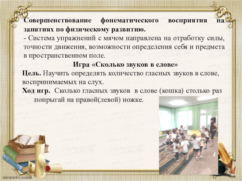 Слайд 15Совершенствование фонематического восприятия на занятиях по физическому развитию.