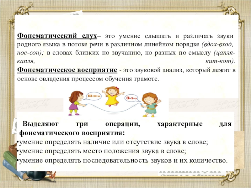 Фонематическое восприятие - это звуковой анализ, который лежит в основе овладения процессом обучения грамоте.