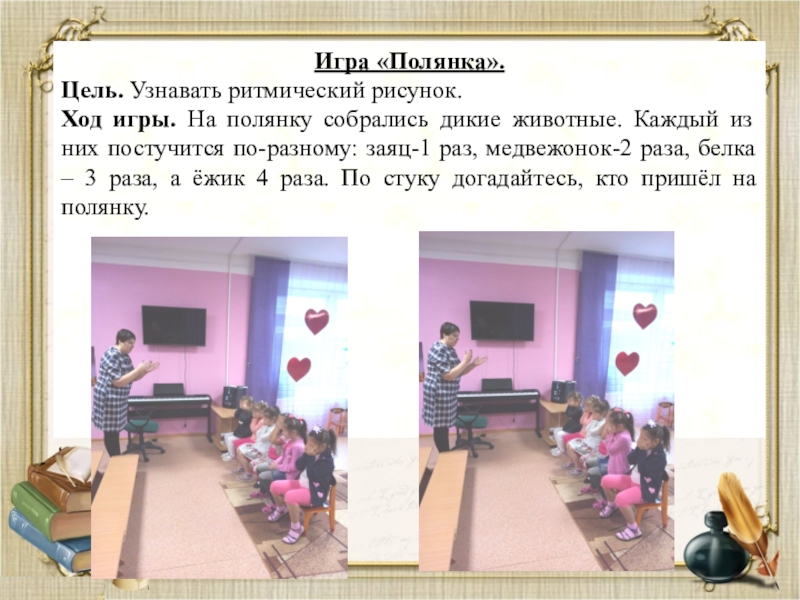 Задачи. Учить воспроизводить и дифференцировать ритмы с опорой на зрительный, слуховой и двигательный анализаторы; развивать слуховое и зрительное внимание, память, чувство ритма, умение изменять голос по высоте, силе, длительности.