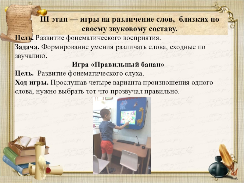 Слайд 12III этап — игры на различение слов, близких по своему звуковому