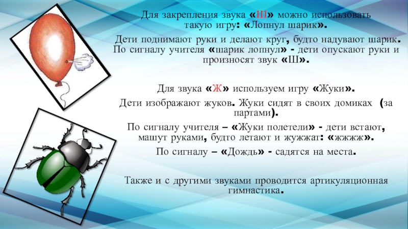 Слайд 6Для закрепления звука «Ш» можно использовать такую игру: «Лопнул шарик».