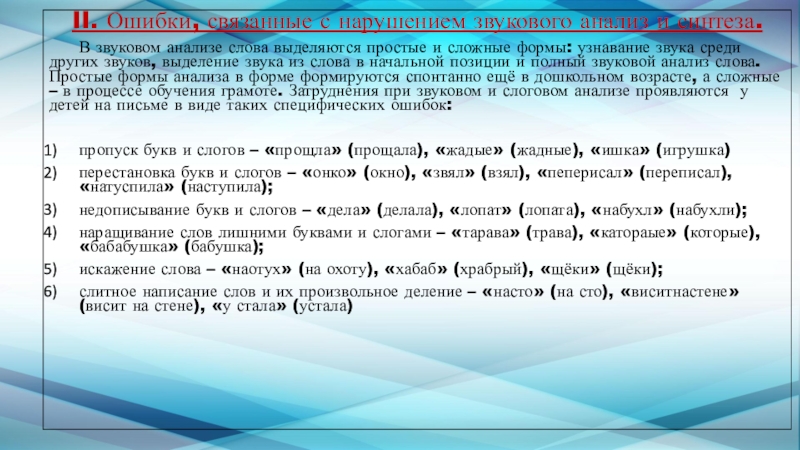 Слайд 11II. Ошибки, связанные с нарушением звукового анализ и синтеза.