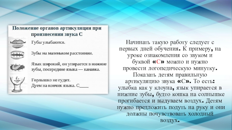 уроке ознакомления со звуком и буквой «С» можно и нужно провести логопедическую минутку. Показать детям правильную артикуляцию звука «С». То есть: улыбка как у клоуна, язык упирается в нижние зубы, будто кошка на солнышке прогибается и выдуваем воздух. Детям нужно предложить подуть на руку и они должны почувствовать холодный воздух.