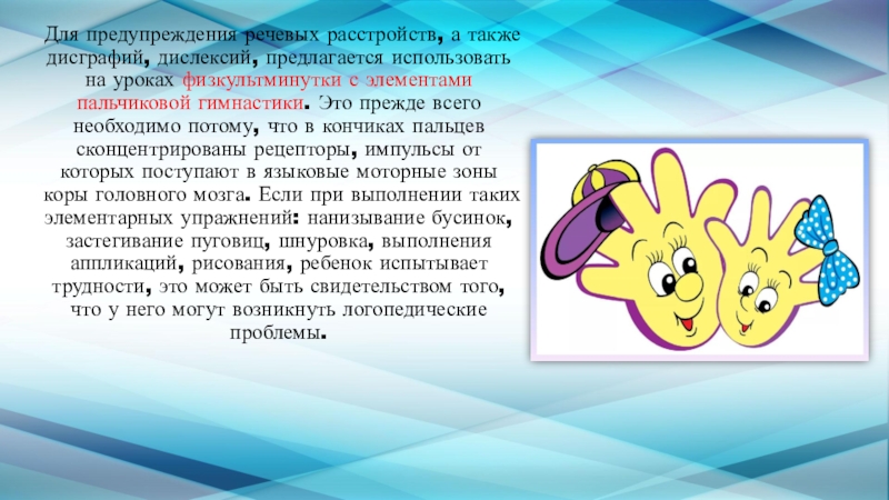 уроках физкультминутки с элементами пальчиковой гимнастики. Это прежде всего необходимо потому, что в кончиках пальцев сконцентрированы рецепторы, импульсы от которых поступают в языковые моторные зоны коры головного мозга. Если при выполнении таких элементарных упражнений: нанизывание бусинок, застегивание пуговиц, шнуровка, выполнения аппликаций, рисования, ребенок испытывает трудности, это может быть свидетельством того, что у него могут возникнуть логопедические проблемы.