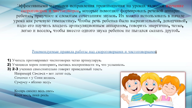 Слайд 7Эффективными методами исправления произношения на уроках является изучение скороговорок и чистоговорок,