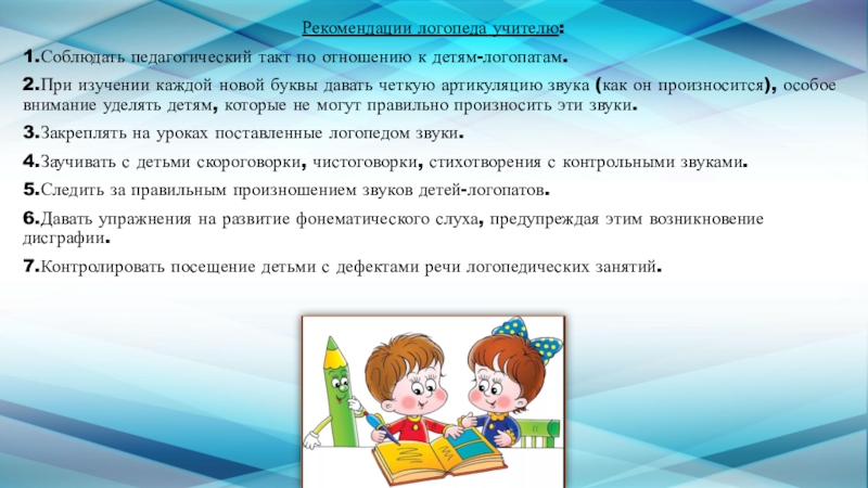 Слайд 18Рекомендации логопеда учителю: