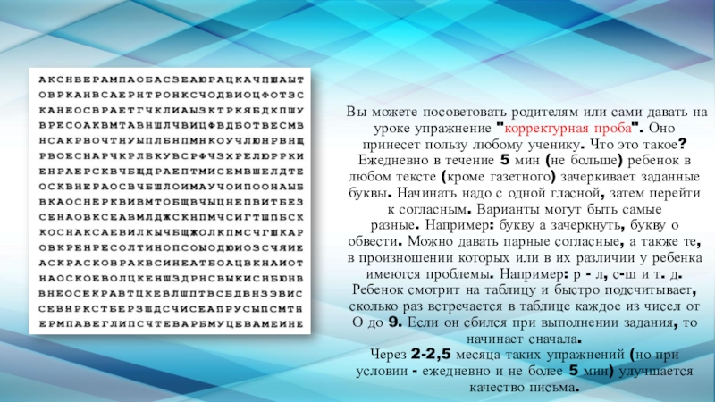 Слайд 15Вы можете посоветовать родителям или сами давать на уроке упражнение "корректурная проба". Оно