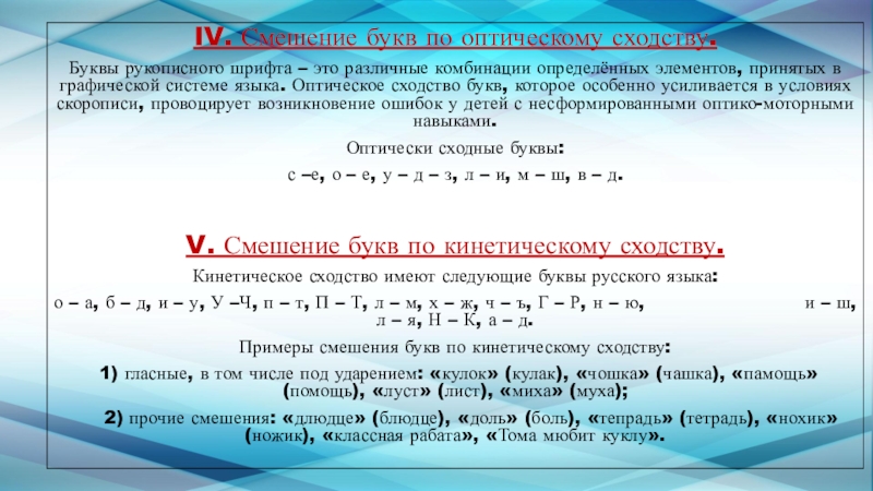 Слайд 13IV. Смешение букв по оптическому сходству.