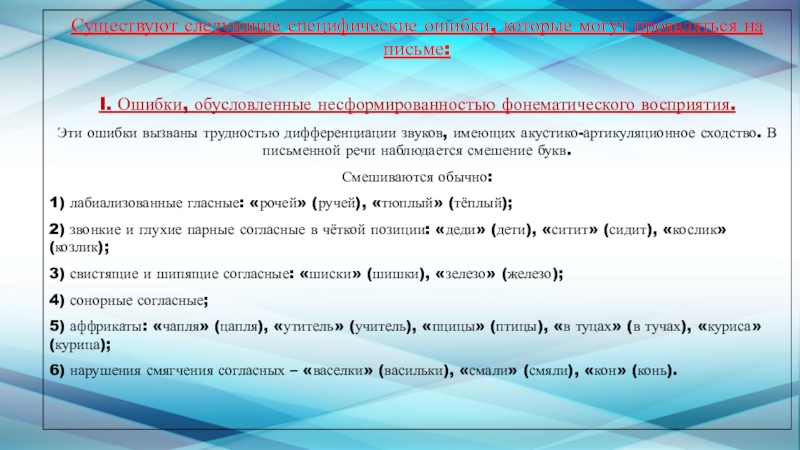 Слайд 10Существуют следующие специфические ошибки, которые могут проявляться на письме: