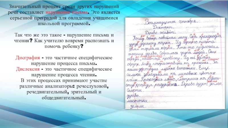 Слайд 9Значительный процент среди других нарушений речи составляет нарушение письма. Это является
