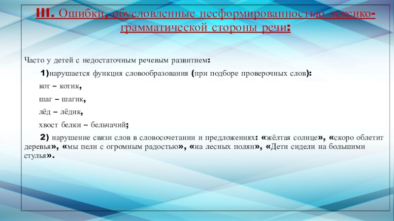 Слайд 12III. Ошибки, обусловленные несформированностью лексико-грамматической стороны речи: