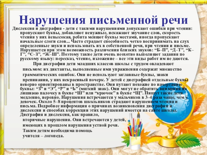 письменной речи - дисграфии. Таким детям необходима