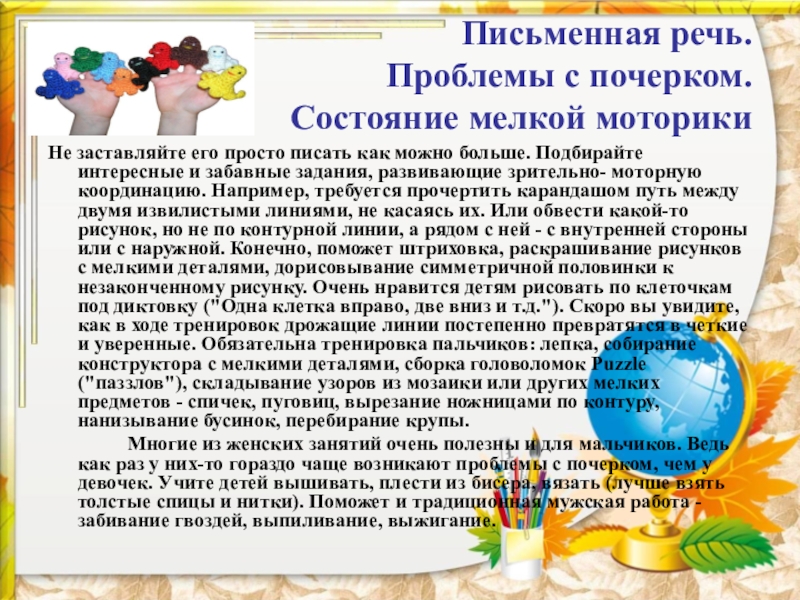 писать как можно больше. Подбирайте интересные и забавные задания, развивающие зрительно- моторную координацию. Например, требуется прочертить карандашом путь между двумя извилистыми линиями, не касаясь их. Или обвести какой-то рисунок, но не по контурной линии, а рядом с ней - с внутренней стороны или с наружной. Конечно, поможет штриховка, раскрашивание рисунков с мелкими деталями, дорисовывание симметричной половинки к незаконченному рисунку. Очень нравится детям рисовать по клеточкам под диктовку ("Одна клетка вправо, две вниз и т.д."). Скоро вы увидите, как в ходе тренировок дрожащие линии постепенно превратятся в четкие и уверенные. Обязательна тренировка пальчиков: лепка, собирание конструктора с мелкими деталями, сборка головоломок Puzzle ("паззлов"), складывание узоров из мозаики или других мелких предметов - спичек, пуговиц, вырезание ножницами по контуру, нанизывание бусинок, перебирание крупы.