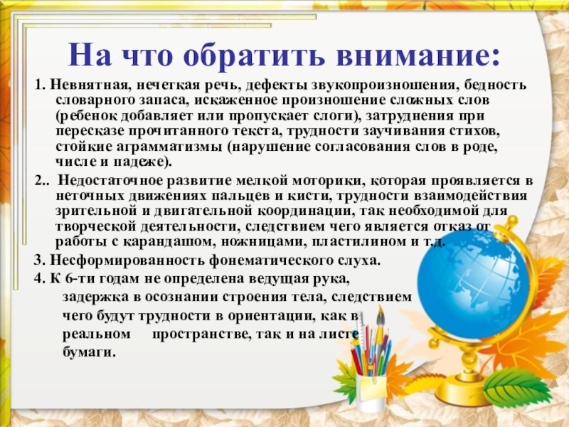 запаса, искаженное произношение сложных слов (ребенок добавляет или пропускает слоги), затруднения при пересказе прочитанного текста, трудности заучивания стихов, стойкие аграмматизмы (нарушение согласования слов в роде, числе и падеже).