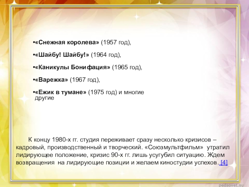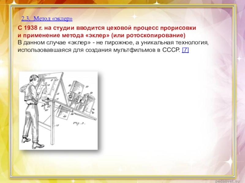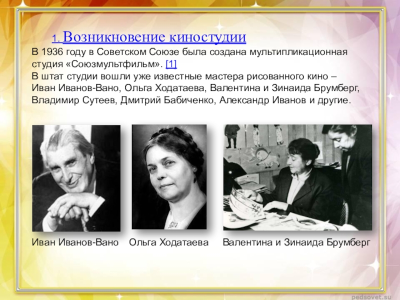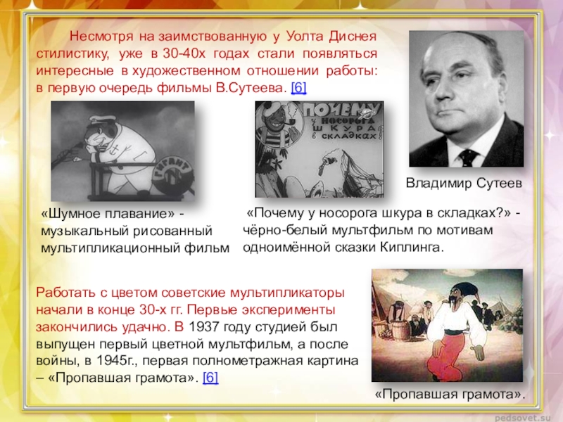 Работать с цветом советские мультипликаторы начали в конце 30-х гг. Первые эксперименты закончились удачно. В 1937 году студией был выпущен первый цветной мультфильм, а после войны, в 1945г., первая полнометражная картина – «Пропавшая грамота». [6]