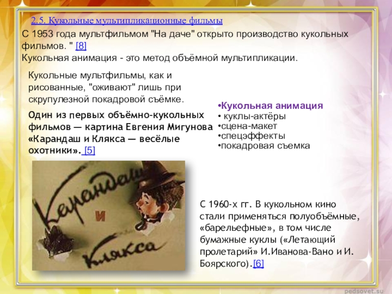 Один из первых объёмно-кукольных фильмов — картина Евгения Мигунова «Карандаш и Клякса — весёлые охотники». [5]