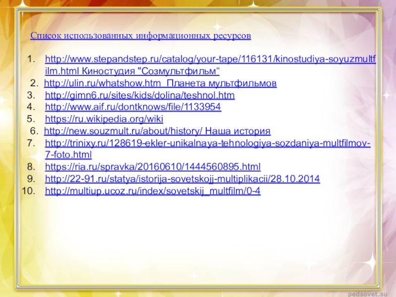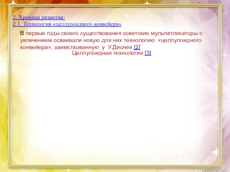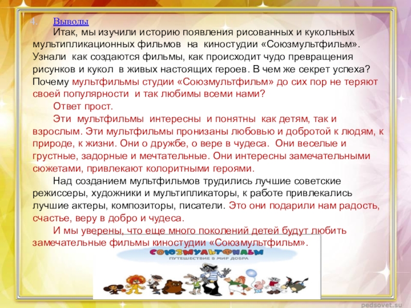 Можно сделать вывод, что первые рисованные мультфильмы были похожи на «диснеевские» мультфильмы, но почти сразу стало понятно, что русская мультипликация будет развиваться по своему особому пути. Это проявилось в постоянном поиске и применении новых технологий изготовления фильмов, в высокой художественности мультипликационных фильмов, но самое главное – в направленности содержания мультфильмов на воспитание ребенка.