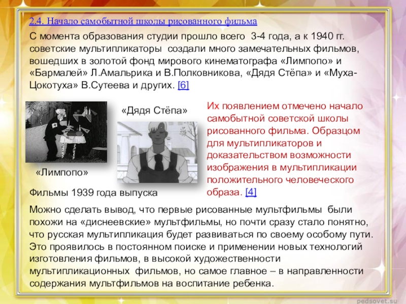 С момента образования студии прошло всего 3-4 года, а к 1940 гг. советские мультипликаторы создали много замечательных фильмов, вошедших в золотой фонд мирового кинематографа «Лимпопо» и «Бармалей» Л.Амальрика и В.Полковникова, «Дядя Стёпа» и «Муха-Цокотуха» В.Сутеева и других. [6]