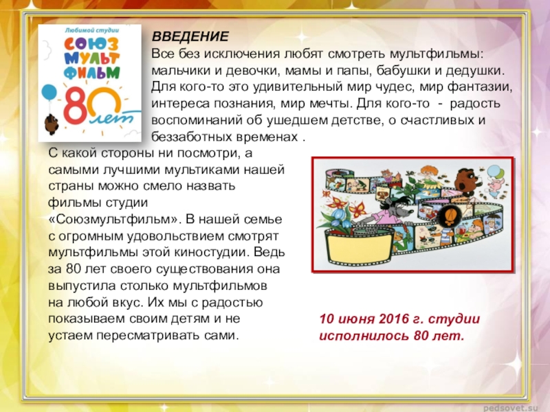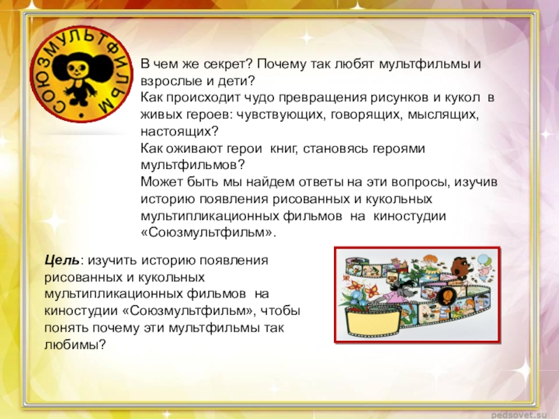 Цель: изучить историю появления рисованных и кукольных мультипликационных фильмов на киностудии «Союзмультфильм», чтобы понять почему эти мультфильмы так любимы?