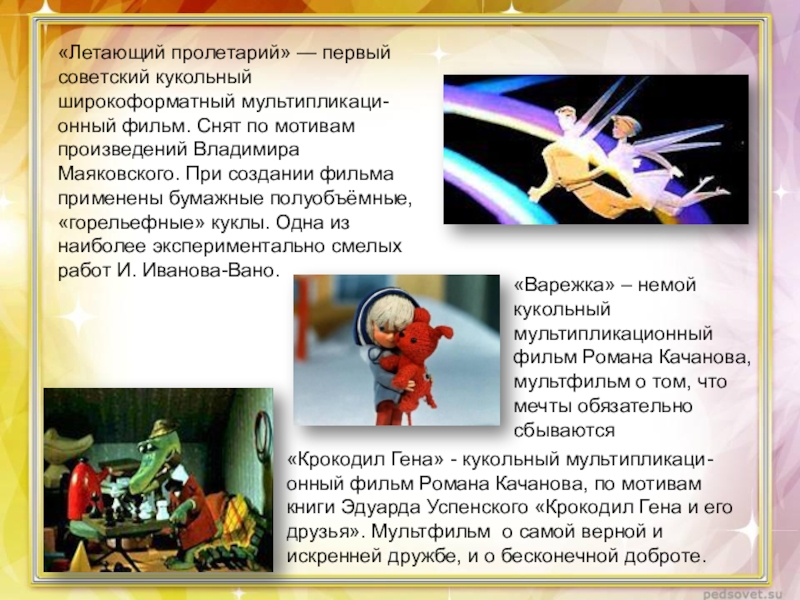 «Крокодил Гена» - кукольный мультипликаци-онный фильм Романа Качанова, по мотивам книги Эдуарда Успенского «Крокодил Гена и его друзья». Мультфильм о самой верной и искренней дружбе, и о бесконечной доброте.