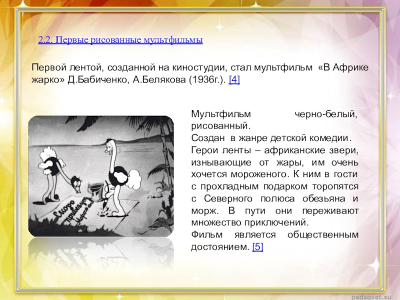Первой лентой, созданной на киностудии, стал мультфильм «В Африке жарко» Д.Бабиченко, А.Белякова (1936г.). [4]