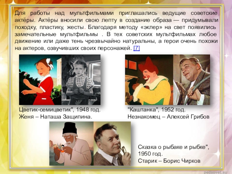 Для работы над мультфильмами приглашались ведущие советские актёры. Актёры вносили свою лепту в создание образа — придумывали походку, пластику, жесты. Благодаря методу «эклер» на свет появились замечательные мультфильмы . В тех советских мультфильмах любое движение или даже тень чрезвычайно натуральны, а герои очень похожи на актеров, озвучивших своих персонажей. [7]
