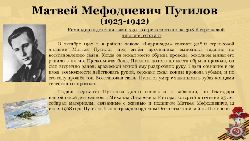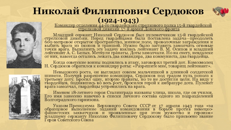 Младший сержант Николай Сердюков был пулеметчиком 15-й гвардейской стрелковой дивизии. Перед гвардейцами была поставлена задача—преодолеть 600-метровое открытое пространство, минное поле, проволочные заграждения и выбить врага из окопов и траншей. Нужно было заставить замолчать огневые точки врага. Выполнить эту задачу взялись лейтенант В. М. Осипов и младший лейтенант А. С. Белых. Метнули гранаты. Доты замолчали. Но на снегу, невдалеке от них, навсегда остались лежать два командира, два коммуниста, два гвардейца.