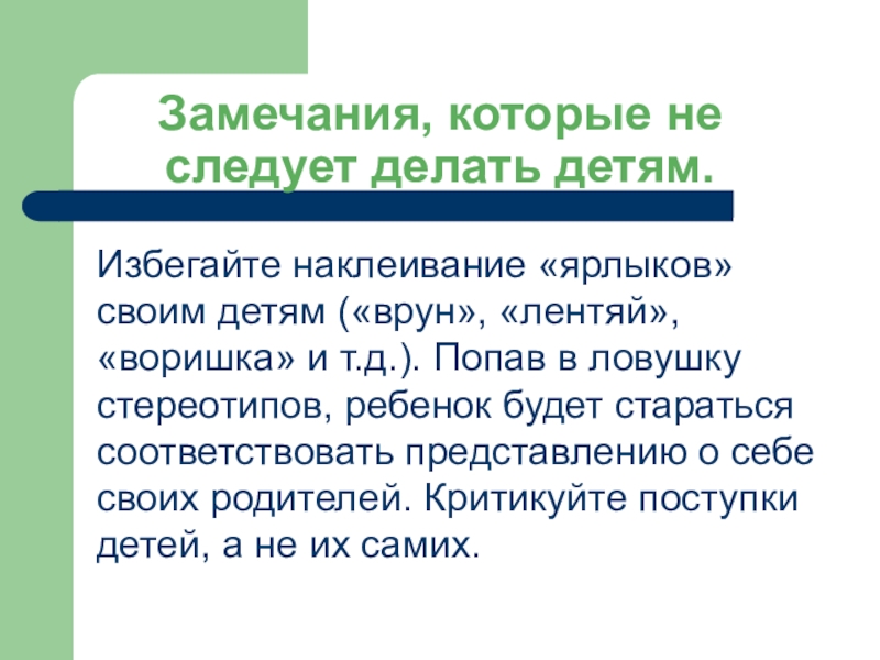 «лентяй», «воришка» и т.д.). Попав в ловушку стереотипов, ребенок будет стараться соответствовать представлению о себе своих родителей. Критикуйте поступки детей, а не их самих.