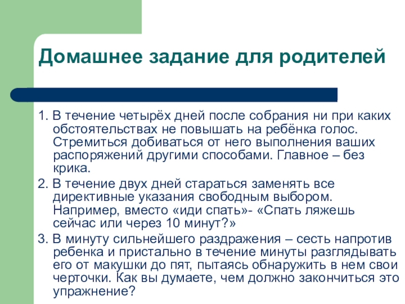 2. В течение двух дней стараться заменять все директивные указания свободным выбором. Например, вместо «иди спать»- «Спать ляжешь сейчас или через 10 минут?»