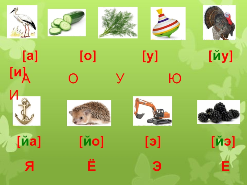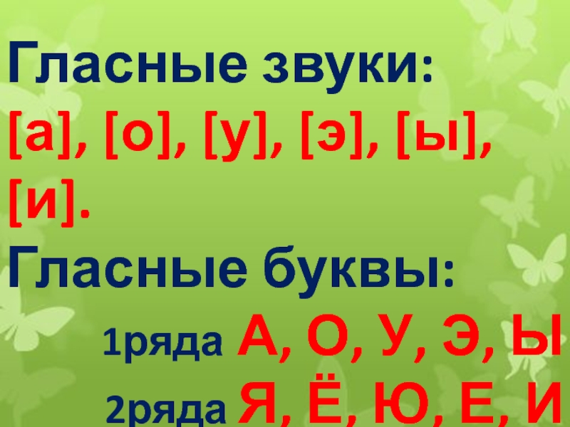 Гласные звуки:[а], [о], [у], [э], [ы], [и].Гласные буквы: 1ряда А, О, У, Э, Ы2ряда Я, Ё, Ю,
