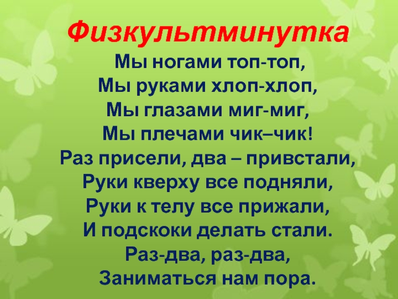 Слайд 5Физкультминутка Мы ногами топ-топ, Мы руками хлоп-хлоп, Мы глазами миг-миг, Мы плечами