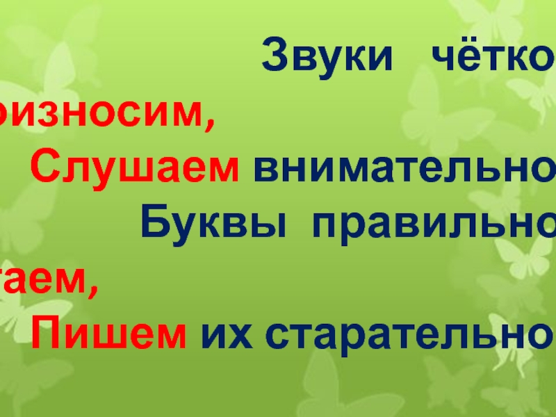 Звуки чётко произносим, Слушаем внимательно Буквы правильно читаем, Пишем их старательно.