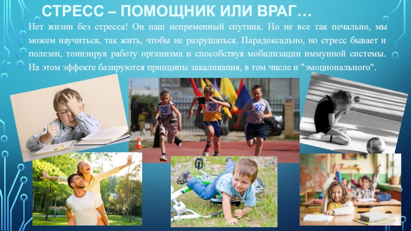 Нет жизни без стресса! Он наш непременный спутник. Но не все так печально, мы можем научиться, так жить, чтобы не разрушаться. Парадоксально, но стресс бывает и полезен, тонизируя работу организма и способствуя мобилизации иммунной системы. На этом эффекте базируются принципы закаливания, в том числе и "эмоционального".