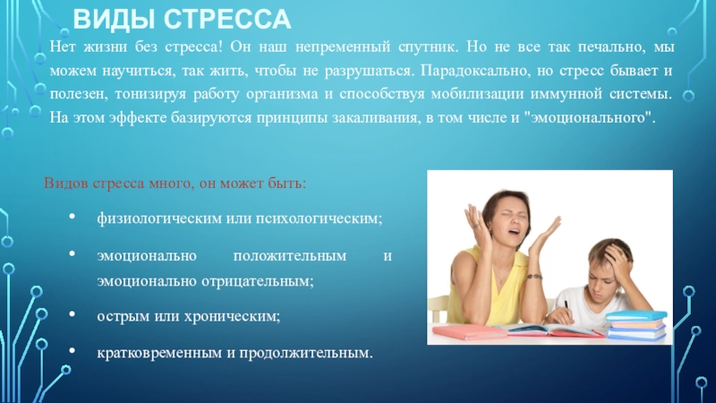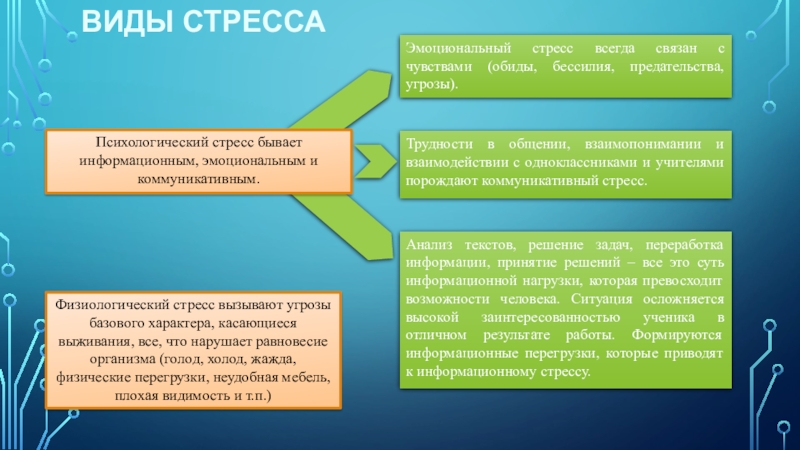 Психологический стресс бывает информационным, эмоциональным и коммуникативным.