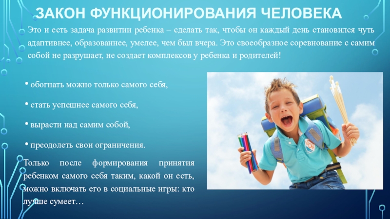 Это и есть задача развитии ребенка – сделать так, чтобы он каждый день становился чуть адаптивнее, образованнее, умелее, чем был вчера. Это своеобразное соревнование с самим собой не разрушает, не создает комплексов у ребенка и родителей!