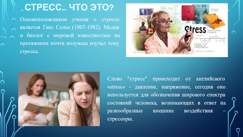Слово "стресс" происходит от английского «stress» - давление, напряжение, сегодня оно используется для обозначения широкого спектра состояний человека, возникающих в ответ на разнообразные внешние воздействия – стрессоры.