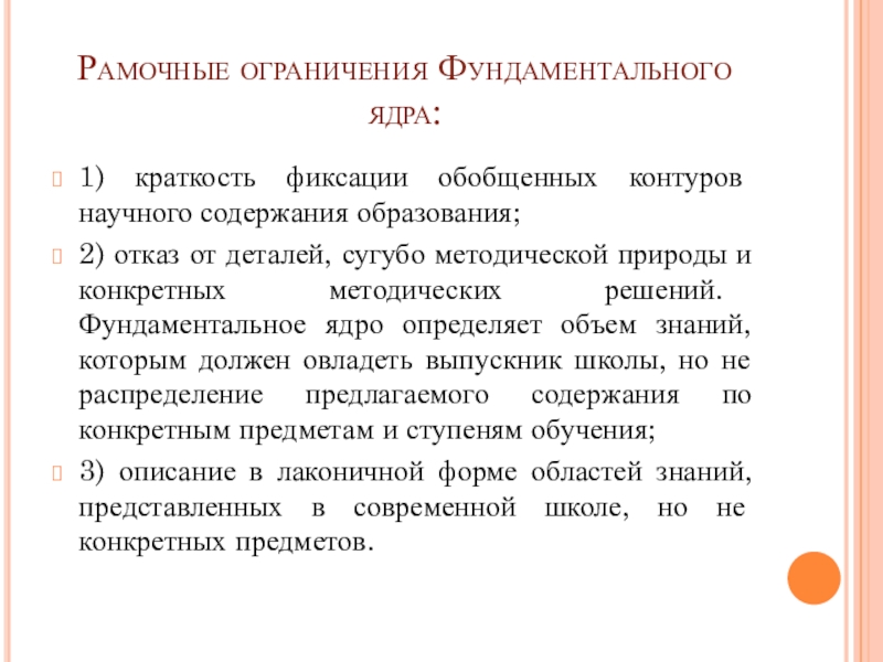 отказ от деталей, сугубо методической природы и конкретных методических решений. Фундаментальное ядро определяет объем знаний, которым должен овладеть выпускник школы, но не распределение предлагаемого содержания по конкретным предметам и ступеням обучения;