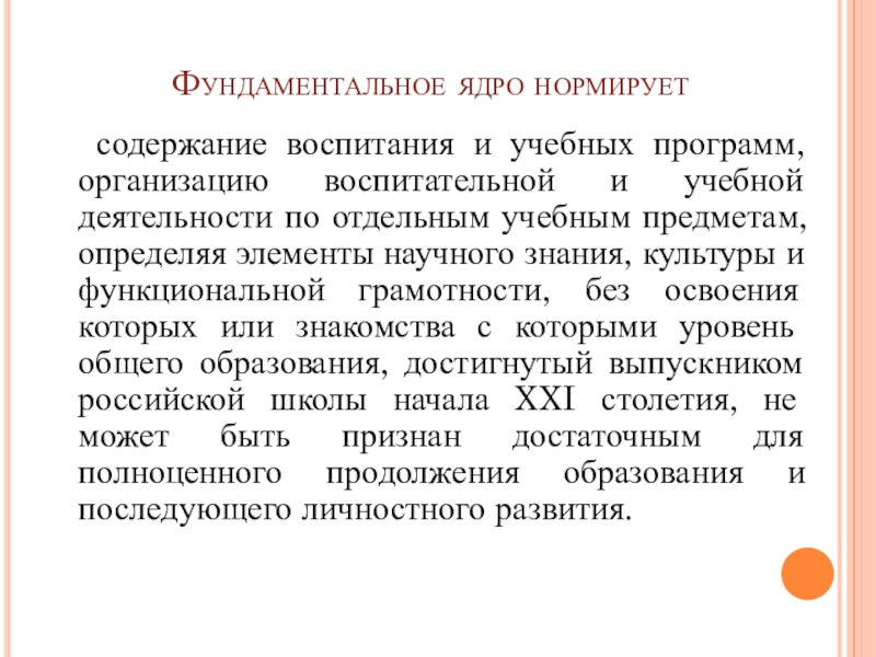 и учебной деятельности по отдельным учебным предметам, определяя элементы научного знания, культуры и функциональной грамотности, без освоения которых или знакомства с которыми уровень общего образования, достигнутый выпускником российской школы начала XXI столетия, не может быть признан достаточным для полноценного продолжения образования и последующего личностного развития.