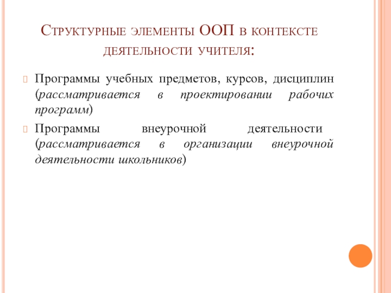 Слайд 30Структурные элементы ООП в контексте деятельности учителя: