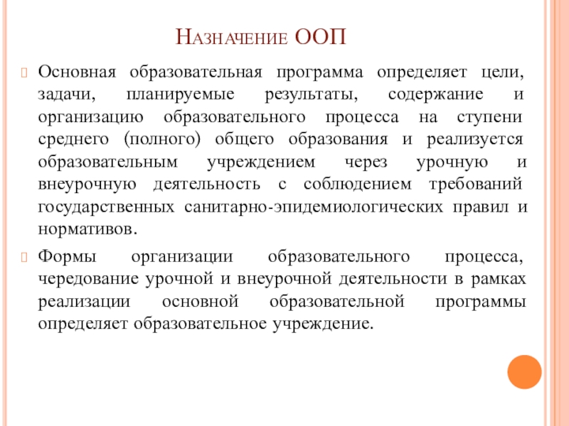 организацию образовательного процесса на ступени среднего (полного) общего образования и реализуется образовательным учреждением через урочную и внеурочную деятельность с соблюдением требований государственных санитарно-эпидемиологических правил и нормативов.