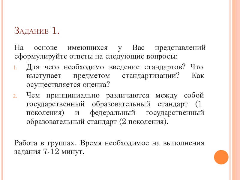 Работа в группах. Время необходимое на выполнения задания 7-12 минут.