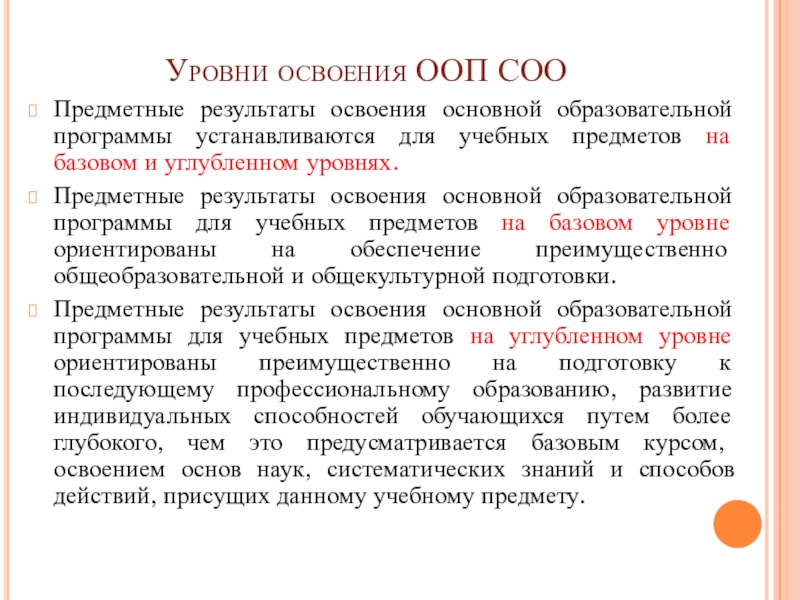 Предметные результаты освоения основной образовательной программы для учебных предметов на углубленном уровне ориентированы преимущественно на подготовку к последующему профессиональному образованию, развитие индивидуальных способностей обучающихся путем более глубокого, чем это предусматривается базовым курсом, освоением основ наук, систематических знаний и способов действий, присущих данному учебному предмету.
