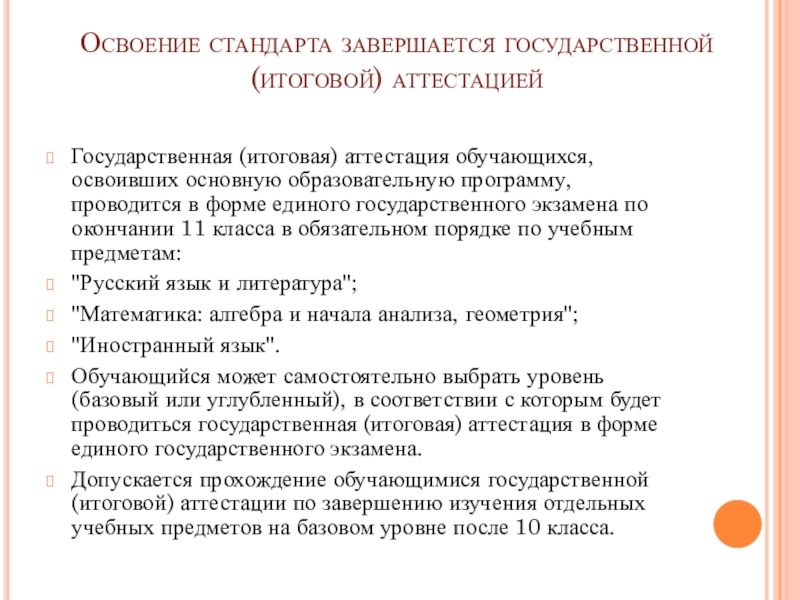 Допускается прохождение обучающимися государственной (итоговой) аттестации по завершению изучения отдельных учебных предметов на базовом уровне после 10 класса.