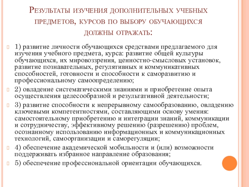 Слайд 21Результаты изучения дополнительных учебных предметов, курсов по выбору обучающихся должны отражать: