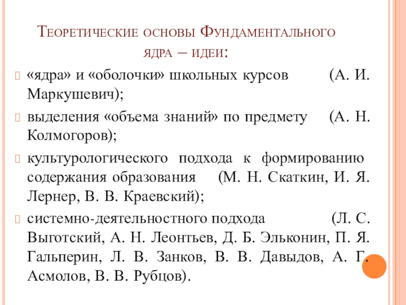 системно-деятельностного подхода (Л. С. Выготский, А. Н. Леонтьев, Д. Б. Эльконин, П. Я. Гальперин, Л. В. Занков, В. В. Давыдов, А. Г. Асмолов, В. В. Рубцов).